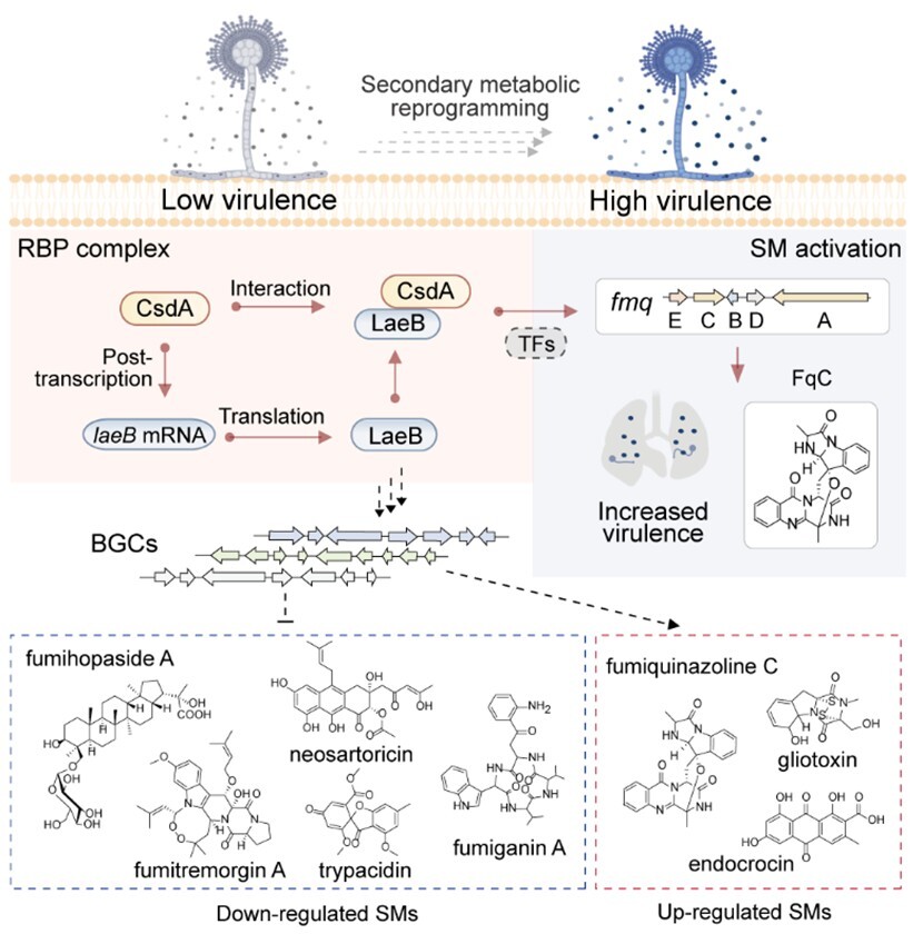 真菌次级代谢产物在病原菌与宿主互作过程中发挥关键作用,但介导代谢重编程与毒力形成的调控因子及关键小分子尚不明确。本研究在病原真菌烟曲霉中鉴定到一个保守的RNA结合蛋白调控复合体,发现RNA结合蛋白CsdA可在细胞核内与全局调控因子LaeB发生互作,进而调控次级代谢产物Fumiquinazoline C的生物合成。破坏CsdA-LaeB互作会促进Fumiquinazoline C合成,并在侵袭性曲霉病小鼠模型中增强真菌的定殖能力与致死率。通过遗传敲除、转录组和代谢组学分析,研究团队证实Fumiquinazoline C是CsdA或LaeB缺失菌株毒力增强所必需的关键代谢物。此外,在广泛的临床菌株中进一步证实了Fumiquinazoline C的积累是CsdA-LaeB调控通路介导毒力的核心效应物。本研究揭示了一种真菌通过次级代谢调控毒力的新模式,为从转录后调控层面解析真菌次级代谢与致病性关联提供了新视角。