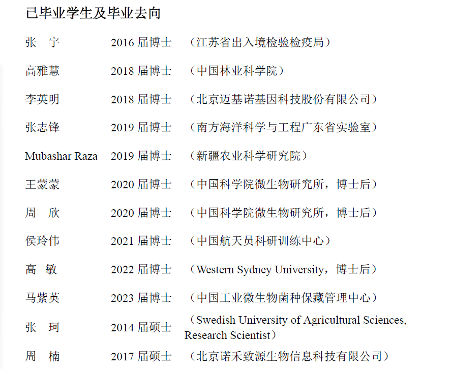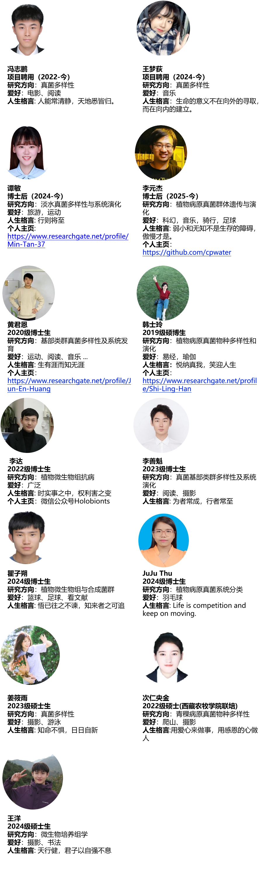 8. 科技部对发展中国家科技援助项目,中泰微生物技术联合实验室,182万元,KY201701011,2018/01-2020/12,项目骨干 代表性文章 共发表学术论文24篇,其中一作/通讯10篇,参编著作2部,荣获“未来之星”曾士迈张树臻院士奖(2017),农业部农业技术推广成果奖二等奖(13/25),第九届大北农科技成果二等奖(排名6/13),任植物病理学会流行专业委员会委员。 1. 梁俊敏#,王科#,杜卓,赵明君,蔡磊*,戴玉成*. 2025.早期描述物种的模式标定及基因组解析—以中国第一个被描述的真菌新种五棱散尾鬼笔为例.菌物学报. 44: 240296.10.13346/j.mycosystema.240296 2. Liang JM, Huang JE, Wu LH, Cai L*. 2023. The Chinese Microbial Type-strain Genome Project. The Innovation Life, 1:100045.https://doi.org/10.59717/j.xinn-life.2023.100045 3. Liang JM, Li YJ, Dodds PN, Figueroa M, Sperschneider J, Han SL, Tsui CKM, Zhang KY, Li LF, Ma ZH, Cai L*. 2023. Haplotype-phased and chromosome-level assembly ofPuccinia polysora, a giga-scale fungal pathogen causing southern corn rust.Molecular Ecology Resources, 23: 601–620.https://doi.org/10.1111/1755-0998.13739 4. Liang JM*, Pecoraro L, Cai L, Yuan ZL, Zhao P, Tsui KMC, Zhang ZF. 2021. Phylogenetic Relationships, Speciation, and Origin of Armillaria in the Northern Hemisphere: A Lesson Based on rRNA and Elongation Factor 1-Alpha. Journal of Fungi. 7: 1088.https://doi.org/10.3390/jof7121088 5. Liang JM, Li GS, Hou LW, Zhao MQ, Cai L*.2021.Leptosphaerulinaspecies isolated from golf turfgrass in China with description ofL. macrosporasp. nov.Mycologia,113: 956–967.https://doi.org/10.1080/00275514.2021.1923298 6. Liang JM, Liu XF, Tusi CKM, Ma ZH, Luo Y*. 2021. Genetic structure and asymmetric migration of wheat stripe rust pathogen in western epidemic areas of China.Phytopathology,111: 1252–1260.https://doi.org/10.1094/PHYTO-06-20-0236-R 7. Liang JM, Li GS, Zhao MQ*,Cai L*.2019. A new leaf blight disease of turfgrasses caused byMicrodochium poaesp. nov.Mycologia, 111: 265–273.https://doi.org/10.1080/00275514.2019.1569417 8. Liang JM#, Li GS#, Zhou SY, Zhao MQ*, Cai L*.2019.Myrothecium-like new species from trufgrasses and associated rhizosphere.MycoKeys, 51: 29–53.https://doi.org/10.1080/00275514.2019.1569417 9. Liang JM, Liu XF, Li Y, Wan Q, Ma ZH*, Luo Y*. 2016. Population genetic structure and migration ofPuccinia striiformisf. sp.triticibetween Gansu and Sichuan Basin populations of China,Phytopathology, 106: 192–201.https://doi.org/10.1094/PHYTO-03-15-0081-R 10. Liang JM,Lofgren L, Ma ZH, Ward TJ, Kistler HC. 2015. Population subdivision ofFusarium graminearumfrom Barley and Wheat in the Upper Midwestern United States at the turn of the century.Phytopathology, 105: 1466–1474.https://10.1094/PHYTO-01-15-0021-R 11. Liang JM, Herry H, Broz K, Dong YH, McCormick SP, Abramova S, Ward TJ, Ma ZH, Kistler HC. 2014. Temporal and spatial dynamics ofFusarium graminearumpopulations in Midwestern United States.Fungal Genetic and Biology,73: 83–92.https://10.1016/j.fgb.2014.10.002 12. Liang JM#, Wan Q#, Luo Y*, Ma ZH*. 2013. Population genetic structures ofPuccinia striiformisin Ningxia and Gansu of China.Plant Disease,97: 501–509.https://doi.org/10.3390/genes12111712 周欣(2020.09-今) 副研究员 研究方向:植物抗病微生物组学与人工合成菌群构建 科研及工作经历 2024.11-今 中国科学院微生物研究所 副研究员 2020.09-2024.11 中国科学院微生物研究所 特别研究助理 2016.03-2017.03 加拿大农业与食品部-渥太华研究发展中心,联合培养博士 2014.09-2020.08 中国科学院大学,理学博士学位 2010.09-2014.07 东北林业大学,理学学士学位 主持及参与科研项目: 1. 国家自然基金青年项目,基于培养组学挖掘番茄根际真菌多样性及抗枯萎病合成菌群的构建,NSFC32300009,30万,2024/01-2026/12,主持。 2. 内蒙古自治区中央引导地方专项,根际微生物调控玉米和大豆耐盐碱的功能和机制研究,2022ZY0032,10万,2022/08-2024/08,主持。 3. 真菌学国家重点实验室优秀青年基金,番茄根际菌群抑制枯萎病的效果及其调控机制,SKLMQN202101,5万,2021/04-2022/04,主持。 代表性文章 1. Zhou WQ#, Zhou X#, Cai L, Jiang Q, Zhang R*. 2023. Temporal and Habitat Dynamics of Soil Fungal Diversity in Gravel-Sand Mulching Watermelon Fields in the Semi-Arid Loess Plateau of China; Microbiology Spectrum, 1,1: e03150-22. https://doi.org/10.1128/spectrum.03150-22 2. Zhou X, Wang J, Liu F, Liang J, Zhao P, Tsui CK, Cai L*. 2022. Cross-kingdom synthetic microbiota supports tomato suppression of Fusarium wilt disease; Nature Communications, 13: 7890. https://doi.org/10.1038/s41467-022-35452-6 3. Zhou X, Zhang HL, Lu XW, Zhao P, Liu F, Qi ZH, Tang F, Cai L*. 2022. Applying meta-data of soybean grain in origin trace and quarantine inspection; Food Research International, 162: 111998. https://doi.org/10.1016/j.foodres.2022.111998 4. Qi ZH#, Zhou X#, Tian L, Zhang HY, Cai L*, Tang F*. 2022. Distribution and characteristics of mycotoxin-producing fungal taxa across major rice production areas of China; Food Control, 134: 108572 https://doi.org/10.1016/j.foodcont.2021.108572 5. Qi ZH#, Zhou X#, Tian L, Zhang HY, Cai L*, Tang F*. 2022. Temporal and spatial variation of microbial communities in stored rice grains from two major depots in China; Food Research International, 152: 110876. https://doi.org/10.1016/j.foodres.2021.110876 6. Zhou X, Wang JT, Wang WH, Tsui KM, Cai L*. 2021. Changes in bacterial and fungal microbiomes associated with tomatoes of healthy and infected by Fusarium oxysporum f.sp. lycopersici; Microbial Ecology, 81: 1004-1017. https://doi.org/10.1007/s00248-020-01535-4 7. Zhou X, Wang JT, Zhang ZF, Li W, Chen W*, Cai L*. Microbiota in the rhizosphere and seed of rice from China, with reference to their transmission and biogeography, Frontiers in Microbiology, 11: 995. https://doi.org/10.3389/fmicb.2
